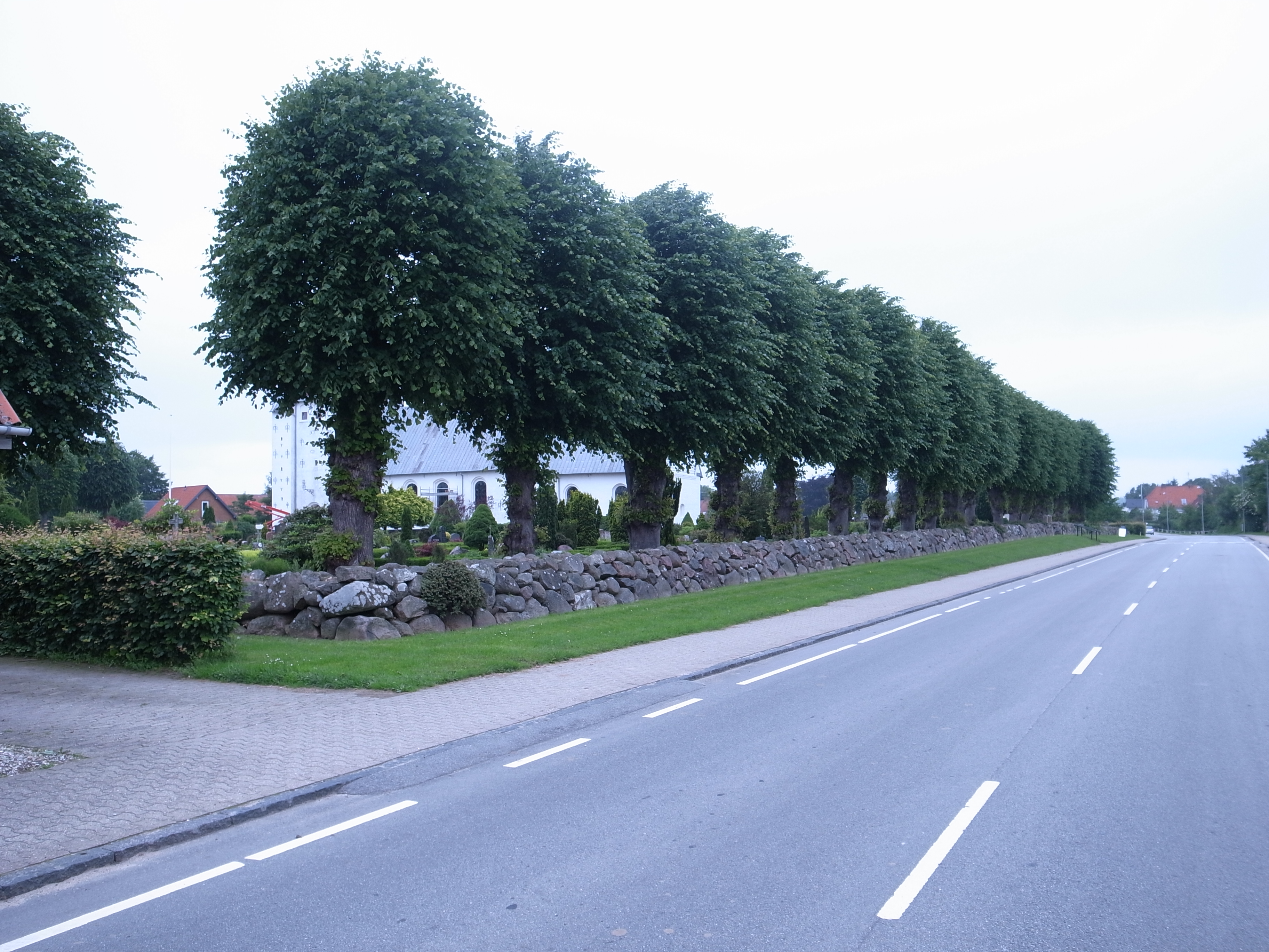 En imponerende række lindetræer på Fjelstrup Kirkegård. Alder formodentlig omkring 100 år.